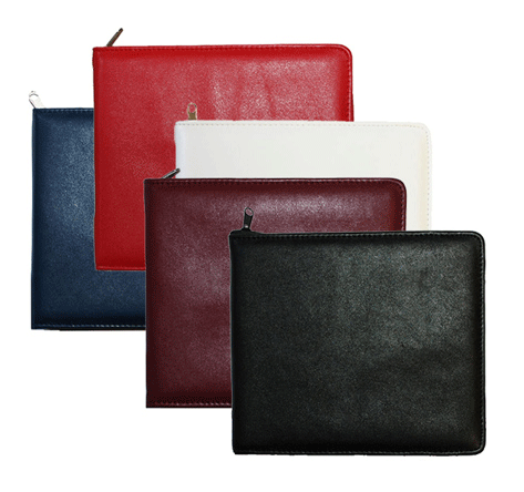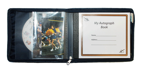 Features : These 7" x 6" zippered vinyl autograph books feature a 50-sheet square blank autograph book, a clear poly CD pocket, and three 3 3/4" x 5 1/8" photo sleeves. They're available with black, white, red, blue, or burgundy covers, with matching zippers, pen loops and linings. For the Stock Imprinted Zippered Autograph Books you have the option of choosing which color autograph book to the two choices of stock imprints (one is 'Autographs' and the other is 'My Autograph Book' with stars) to the color of the foil stamp (Gold or Silver Foil Stamp) used.