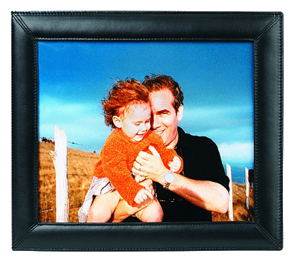 Top grain Napa leather, finished with fine stitching around the edges. May be used either horizontally or vertically, on a desk or on a wall. It beautifully frames an 8 x 10 photograph. Measures 9 7/8" x 12" x 1/4".
