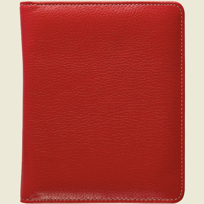 This travel frame measures 5 1/4" x 6 1/2" closed, and opens to display two 4" x 6" picture holders. Pebble-textured top-grain cowhide, available in black, mocha, red, orange, yellow, blue, turquoise, magenta, baby pink and lime.