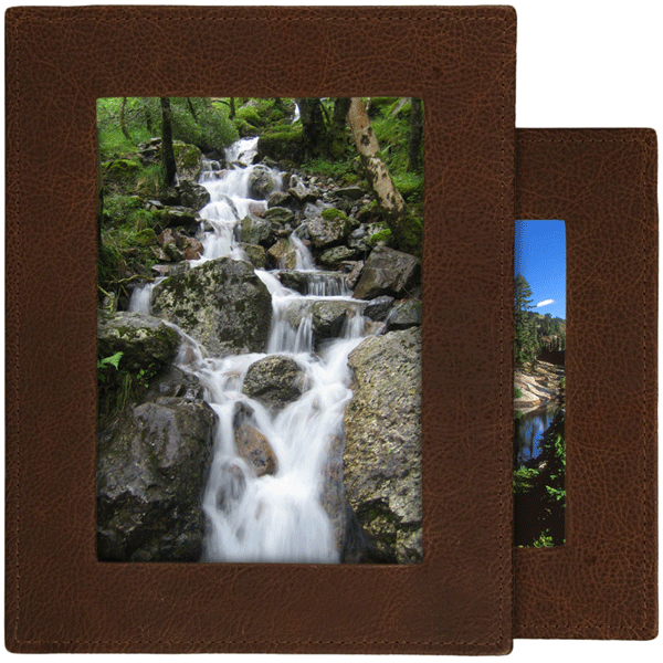 Square-edged leather photo frames hold 5" x 7" photographs. Top loading, and may be used horizontally or vertically. Choice of three textured antiqued leather colors: black, brown and cognac tan.