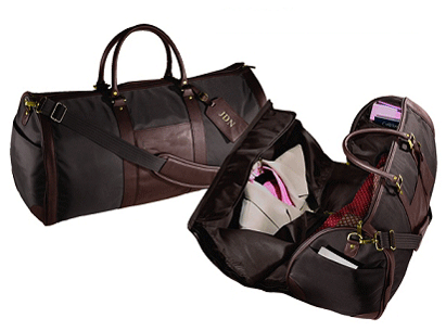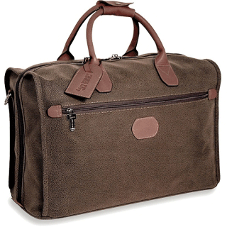 Made of modern 600d rip-stop polyester. Inside the main compartment are two brackets to hold eight hangers, dual mesh pockets at the top corners to hold accessories, and four shoe pockets on the extension bottom which holds garments up to 56" long. The opposite side features four large pockets for shirts, socks, sweaters, etc. Three zip pockets outside for laundry. It's extra large with lots of pockets, yet still lightweight. Soft-grip handle and detachable shoulder strap. 45" x 23" x 4". Available in black, blue and red.