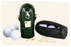 Tee off in style! This golf accessory bag includes three quality golf balls, two tees and a divot tool. The brass-plated lobster claw clips easily to a belt loop. Dimensions: 5 1/2" x 2 3/4" x 2 1/4". Available in brown, green, Burgundy and tan Florentine Napa leather. |